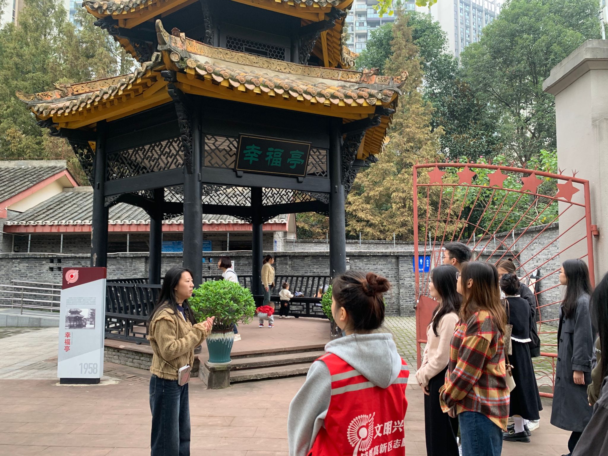 纪念馆右侧的“幸福亭”,是为纪念毛主席视察红光而建的六角亭,不仅承载着对那段历史的记忆,更象征着中国共产党领导下人民幸福生活的美好愿景。自1968年纪念馆成立以来,幸福亭便成为了红光发展历程的见证者,静静诉说着这里的发展与变迁。